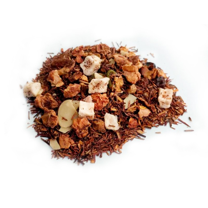 Rooibos, trozos de manzana, pasas, láminas de almendras y pistachos.