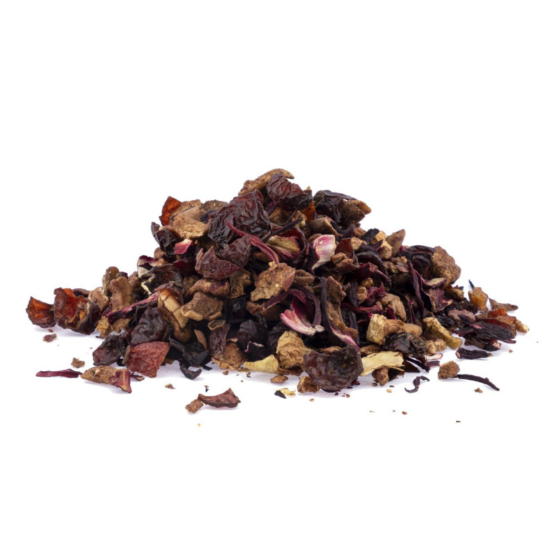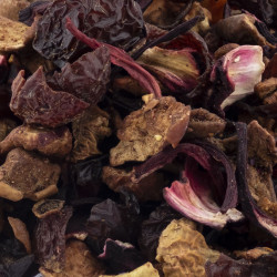 Hibisco, trozos de manzana, escaramujo, trozos de fresas.