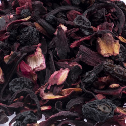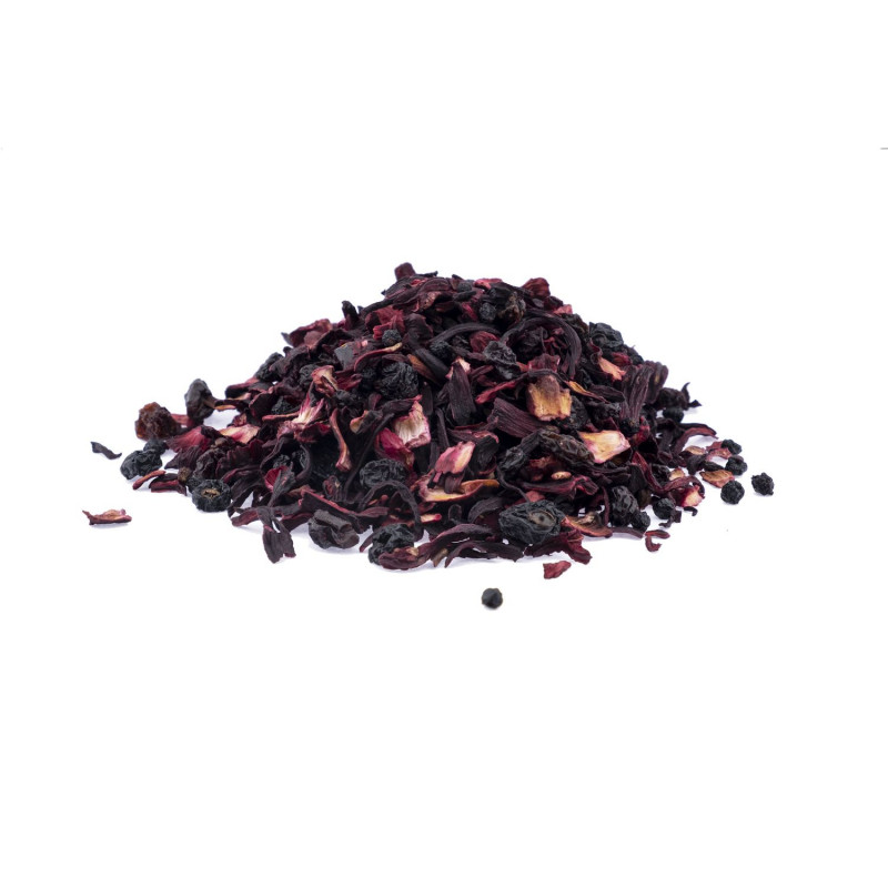 Hibiscos, bayas de sauco, bayas de grosella, arándanos, pasas.