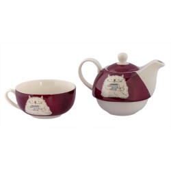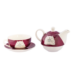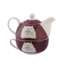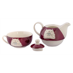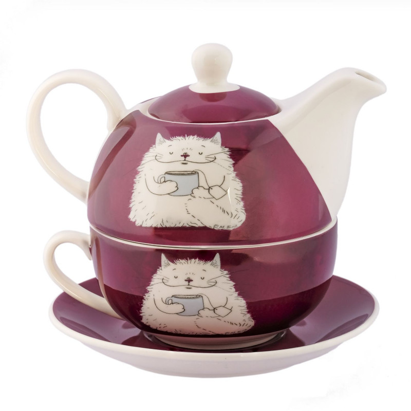 El diseño de los tres productos es el “Barney”, caracterizado por un gato alegre, simpático y regordete que se encuentra placenteramente sintiendo el aroma que desprende su bebida. Combina el color rojizo con el blanco, propio de la porcelana y tanto la tetera como el vaso, cuentan con un asa cada una para servir y beber.