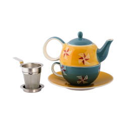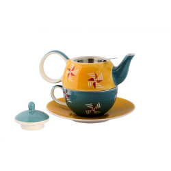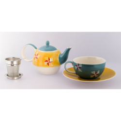 El diseño del “tea for one set” fue pintado a mano y combina diferentes colores, con mayor relevancia de tonos azules y amarillos. Mientras que el platillo y la tetera se centran en el tono más claro, la taza y la tapa, junto con sus dos asas se concentran en el tono más azulado.