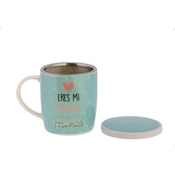 Taza de té con tapa e infusor con el texto “Eres mi persona favorita”. Dedicado a aquellos apasionados en regalar diseños que quieran transmitir emociones, consolidar en un artículo todo el amor que sienten por el otro.