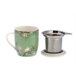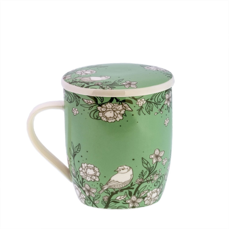 El diseño con flores, pájaros, hojas en blanco y negro, contrasta con un fondo en un tono de verde, cálido y armónico. Esta estampa también se puede encontrar en el mug “Kila”, generando una unidad de decoración.